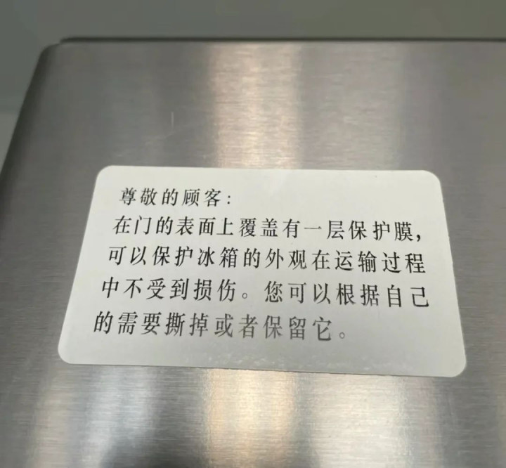 不止如此,很多人觉得用一段时间之后再撕掉外面的保护膜,这样冰箱就又像新的一样了,但其实时间长了,上面的保护膜可能撕都撕不掉。